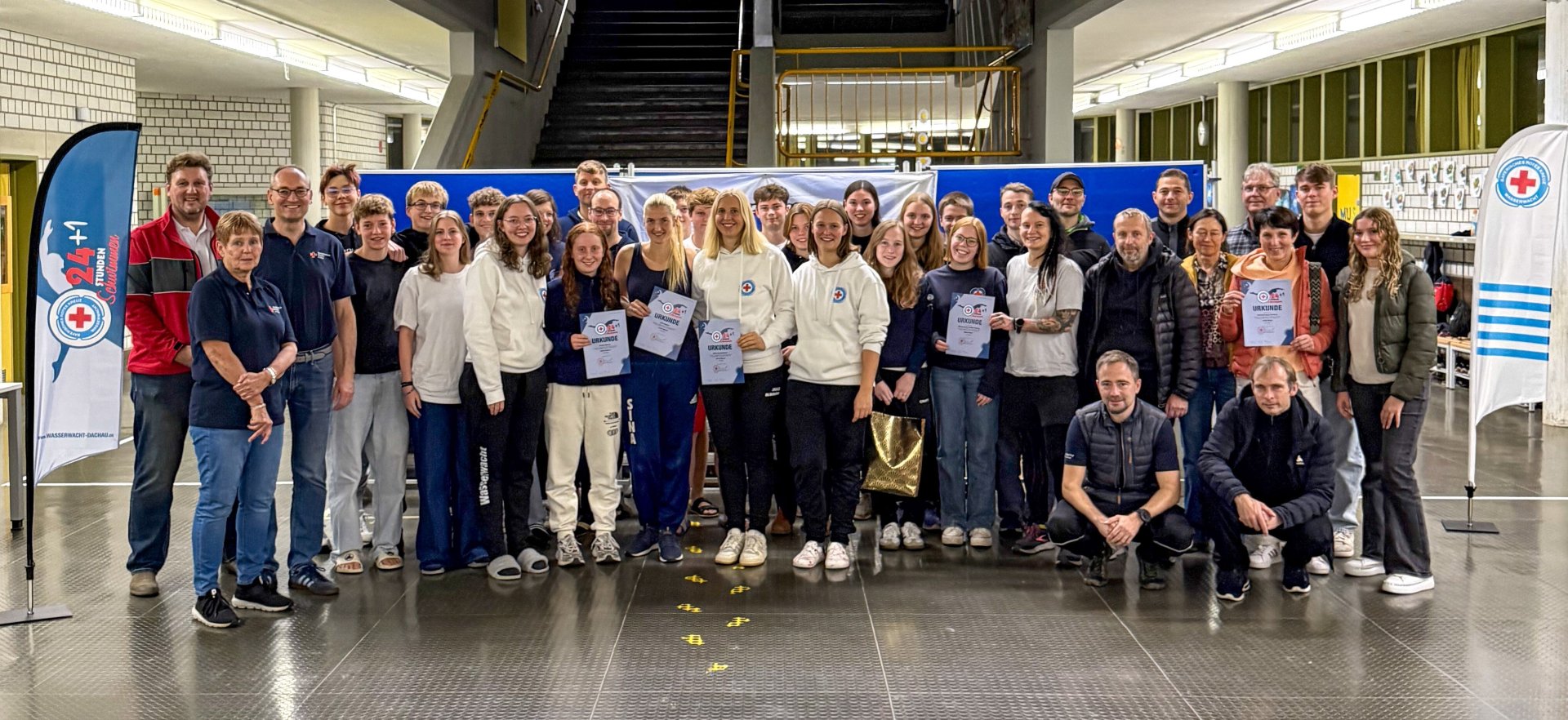 Die Mannschaften, aus denen über die gesamten 25 Stunden über immer ein Team-Mitglied im Wasser sein musste, stammten aus den verschiedensten Bereichen und Regionen. Der Pferdesportverein Markt Indersdorf und ein Schwimmteam aus Aichach stellten eine Mannschaft, befreundete Wasserwachten aus Bad Aibling und Kaufering waren angereist. Der CSU-Kreisverband Dachau schickte eine eigene CSU-Staffel an den Start. Selbstverständlich stellte auch das BRK Dachau mit seinen Bereitschaften, der Wasserwacht Dachau/Karlsfeld und einer Jugend- und Erwachsenenmannschaft aus Ainhofen mehrere Teams.