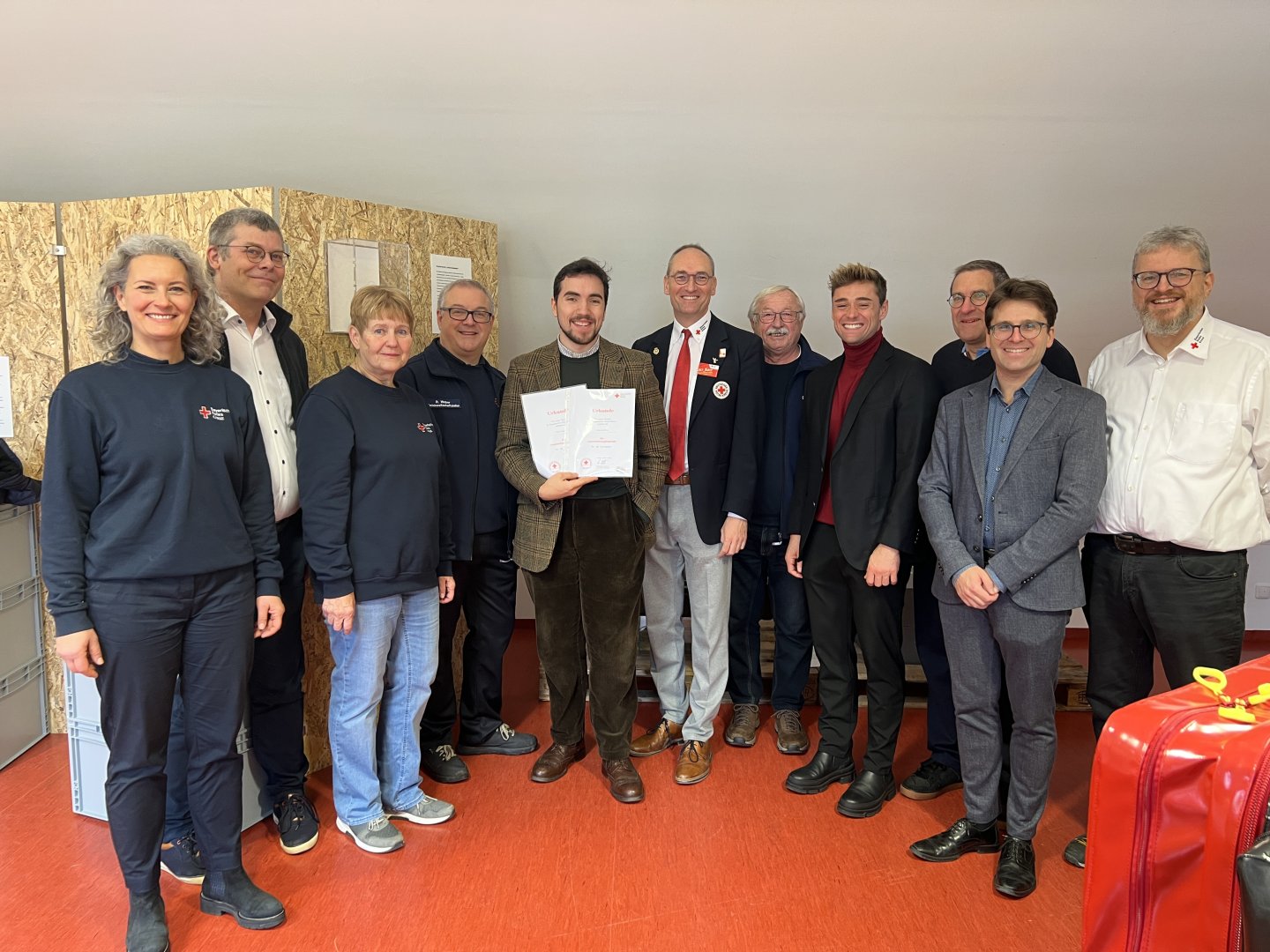 Der Historiker Tizian Bartling ist seit vielen Jahren ein überzeugter Rotkreuzler und wurde mit einer Doppelehrung überrascht. Die stellvertretende Kreisvorsitzende und Beauftragte der Gemeinschaft Wohlfahrts- und Sozialarbeit, Angelika Gumowski, ehrte ihn mit einer Urkunde für zehnjähriges ehrenamtliches Engagement. Der Kreisbereitschaftsleiter Reinhard Weber überreichte Tizian Bartling eine weitere Urkunde: für zehn Jahre Ehrenamt im Katastrophenschutz.