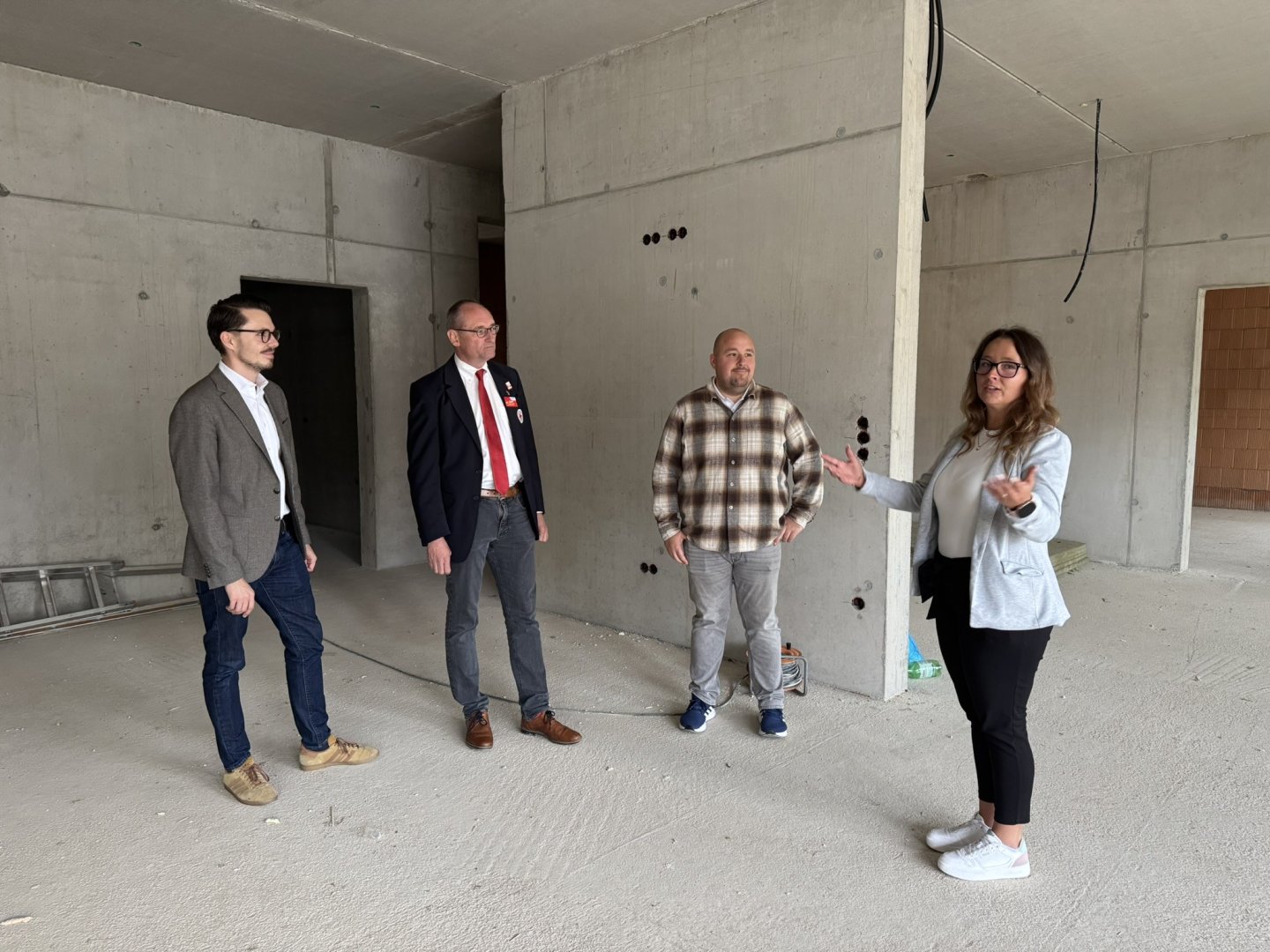 Bald ist es so weit: Die Bauarbeiten zur Tagespflege-Einrichtung des Roten Kreuzes in Altomünster stehen kurz vor dem Abschluss. Der BRK-Kreisvorsitzende Bernhard Seidenath und der BRK-Kreisgeschäftsführer Dennis Behrendt überzeugten sich zusammen mit dem Teamleiter Servicestelle Ehrenamt, Stabsstelle Pflege des BRK Dachau, Timo Weiersmüller, und der Pflegedienstleitung Anja Aydin vom Baufortschritt. „Die Gebäudehülle ist geschlossen, die Elektroarbeiten laufen und die Innenraumausstattung wird gerade finalisiert“, fasste Weiersmüller zusammen. Vor allem die große Wohnküche werde sehr schön, berichtete er bei der Begehung. Mit dem Aufenthaltsbereich wird sie 24 Bewohnern zum gemeinsamen Kochen, Essen, Spielen und Wohlfühlen Platz bieten. Das dreigeschossige Gebäude wird in Kooperation mit der Marktgemeinde Altomünster errichtet. Es liegt Am Brechfeld, mit Blick auf das Alto-Münster und in unmittelbarer Nachbarschaft zum BRK-Kindergarten und zur Kinderkrippe „Regenbogen“. Die Eröffnung ist im Mai 2026 geplant.