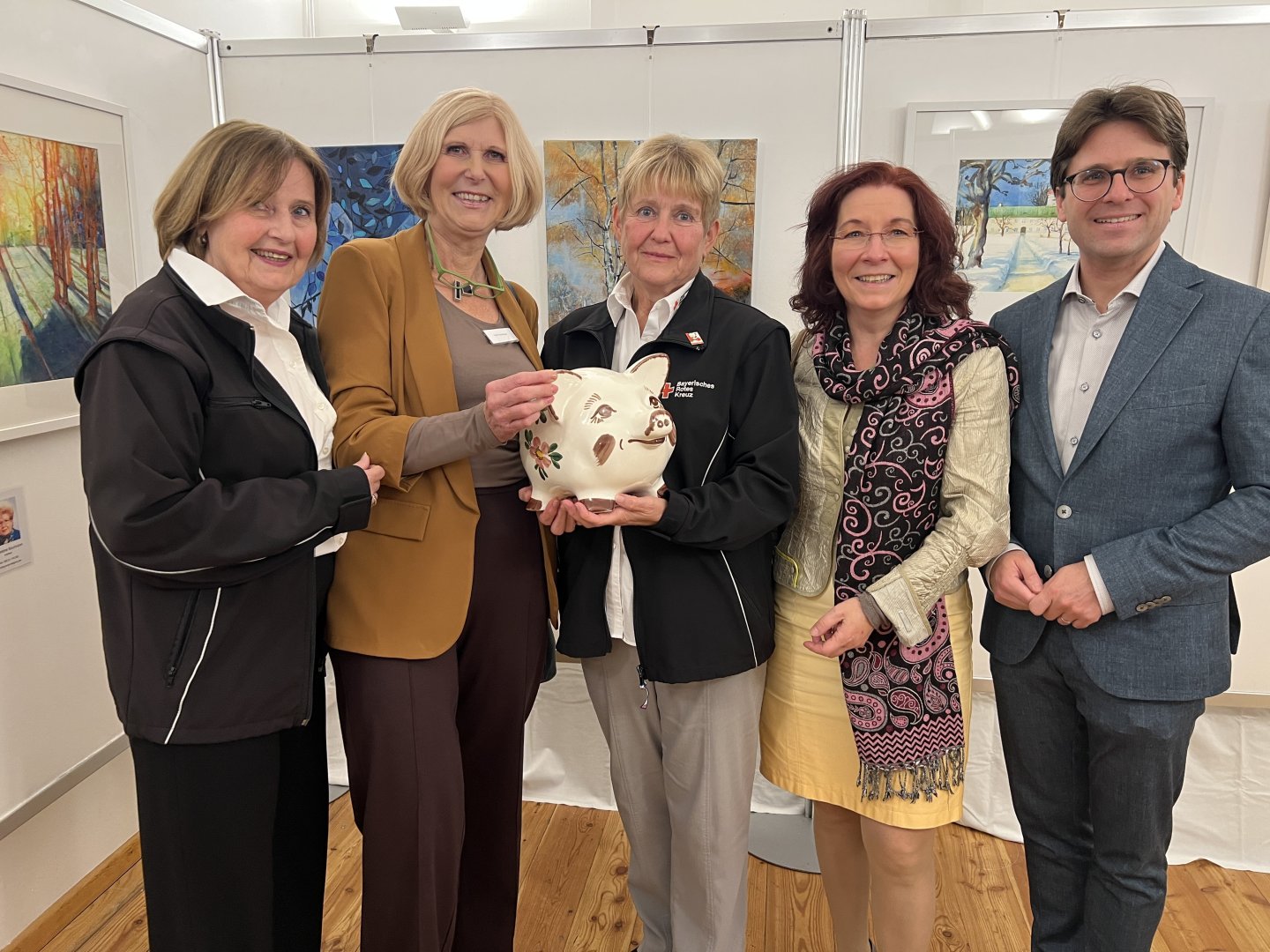Ruth Rumberger überreichte das volle Sparschwein im Beisein von Oberbürgermeister Florian Hartmann und der stellvertretenden Landrätin Marianne Klaffki an die stellvertretende BRK-Kreisvorsitzende Angelika Gumowski, die vom langjährigen ehrenamtliche Rotkreuzmitglied Angelika Kniesl begleitet wurde. Angelika Gumowski dankte Ruth Rumberger stellvertretend für die Mitglieder der Freien Malgruppe für die langjährige Verbundenheit zum BRK Dachau: „Mit Ihrer Spende unterstützen Sie unser Rotes Kreuz bei seinen vielfältigen Aufgaben.“