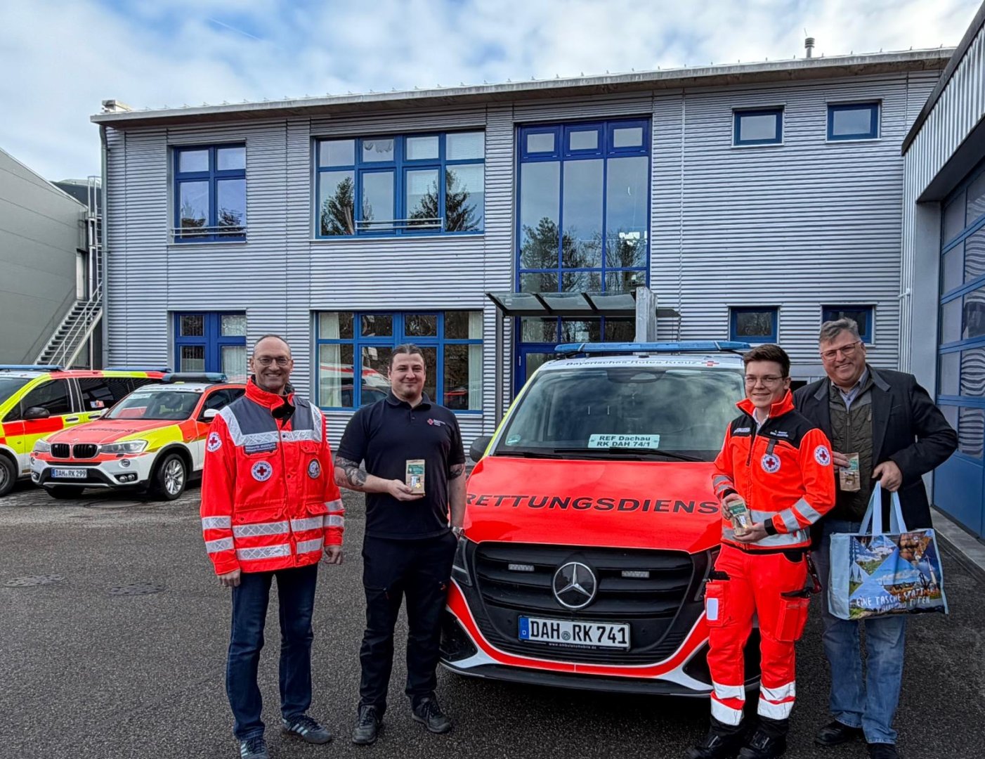 Auch an Silvester stattete Landrat Stefan Löwl den Mitarbeitenden in der Rettungswache in Gröbenried einen Besuch ab, um den Einsatzkräften am letzten Tag des alten Jahres ihre Wertschätzung entgegenzubringen. Der BRK-Kreisvorsitzender Bernhard Seidenath schloss sich vor Ort dem Dank des Landrats für den Dienst der Rotkreuzlerinnen und Rotkreuzler an der Gemeinschaft an. Seidenath berichtete: „Schade nur, dass kaum jemand auf der Wache war. Wegen des schweren Unfalls, der zu diesem Zeitpunkt auf der A 8 bei Sulzemoos passiert war, waren viele Kräfte im Einsatz.“ Wachleiter und Notfallsanitäter Tobias Weber (Zweiter von links) und Lucas Griebel vom Rettungs-Einsatzfahrzeug (REF) freuten sich trotzdem über den Besuch und die Wertschätzung.