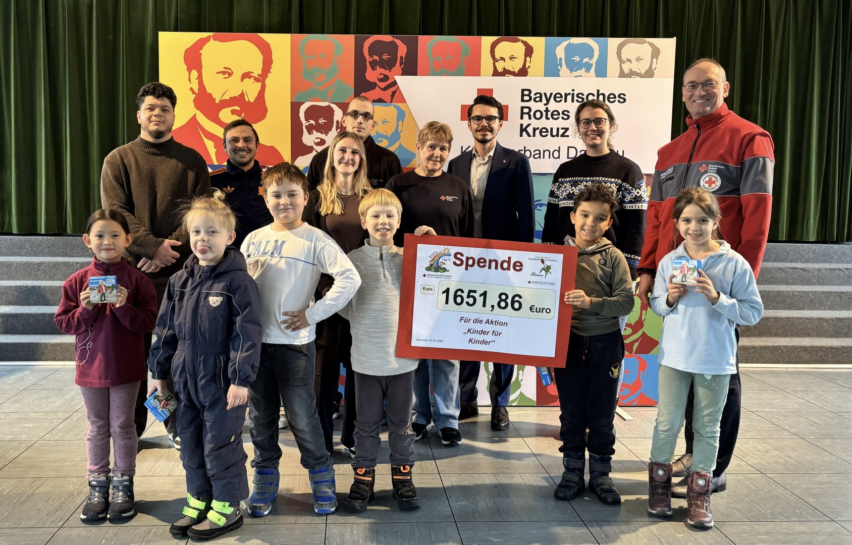 Melanie Papp, Hort-Leiterin der „Karlsfelder Mooshüpfer“, überreichte nun mit einigen Kindern und den Mitarbeitenden Harun Ceylan, Michele Odierna und Anna Geitner den symbolischen Scheck an das BRK Dachau. Der BRK-Kreisvorsitzende Bernhard Seidenath und seine Stellvertreterin Angelika Gumowski betonten: „Diese Aktion erfüllt vorbildlich den Leitsatz unserer Aktion ‚Kinder für Kinder‘: Kinder aus unseren Kindertagesstätten sammeln insbesondere durch ihre Basteleien für andere Kinder, die weniger zur Verfügung haben.“ Der BRK-Kreisgeschäftsführer Dennis Behrendt sagte: „Es ist toll, wenn verschiedene Bereiche aus dem Roten Kreuz so gut zusammenwirken, um gemeinsam Kindern zu Weihnachten eine Freude zu machen.“