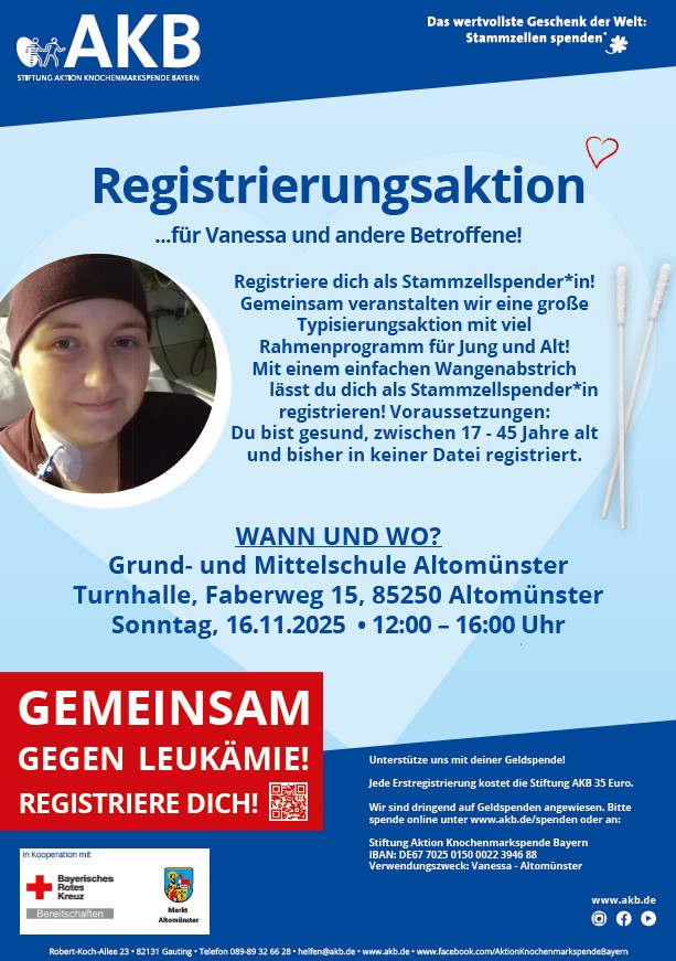 Die Typisierungsaktion steht unter dem Motto „Vanessa (22 Jahre) aus Altomünster braucht euch!“. Die Aktion steht unter der Schirmherrschaft des Altomünsterer Bürgermeisters Michael Reiter und findet am Sonntag, 16. November, von 12 Uhr bis 16 Uhr in der Schulturnhalle in Altomünster, Faberweg 15, statt.